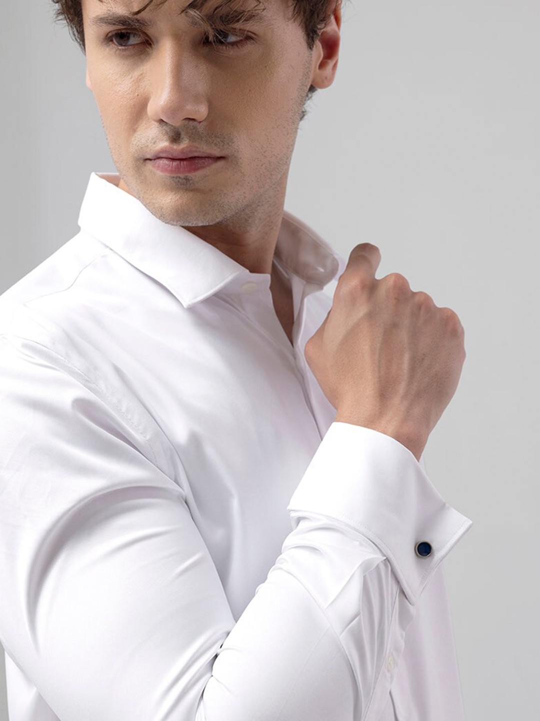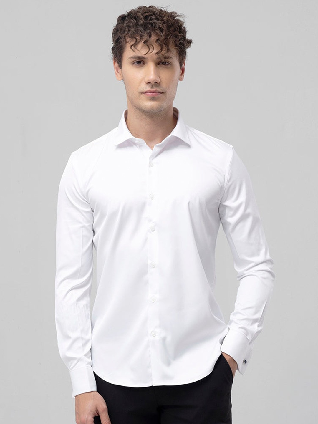 White solid opaque Casual shirt ,has a spread collar, button placket, long regular sleeves, curved hem